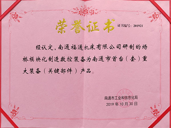 公司通過ISO9001:2015質量體管理系認證、ISO14001:2015環境管理體系認證、ISO45001:2018職業健康安全管理體系認證、先后榮獲:中國機床行業十佳品牌、江蘇名牌產品、江蘇省質量信得過企業、南通市科學技術進步獎、南通市AAA級重合作守信用企業、高新技術企業、南通市首臺(套)重大裝備產品等榮譽。